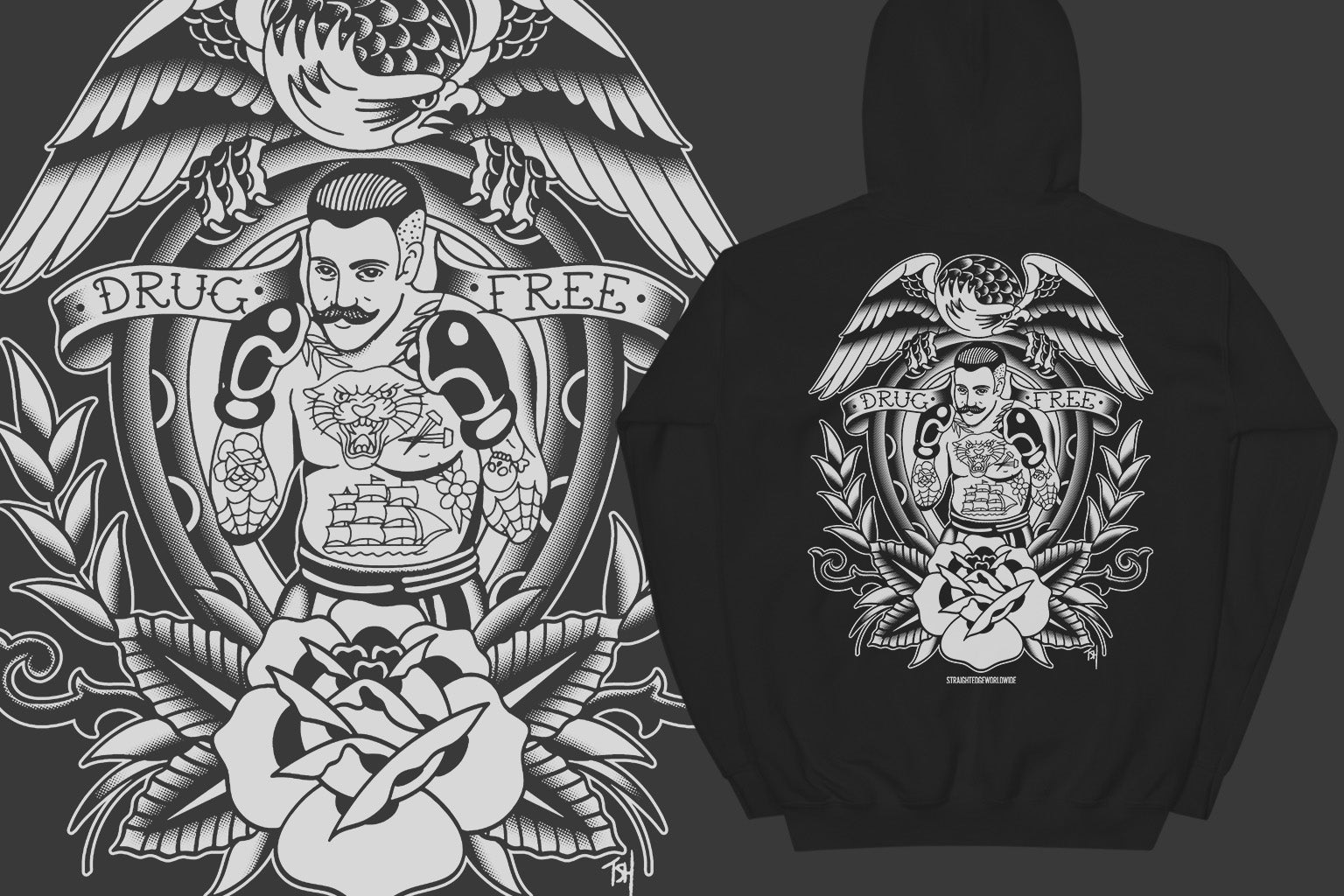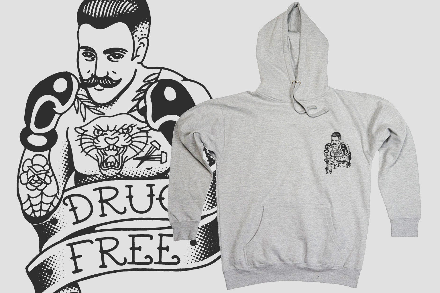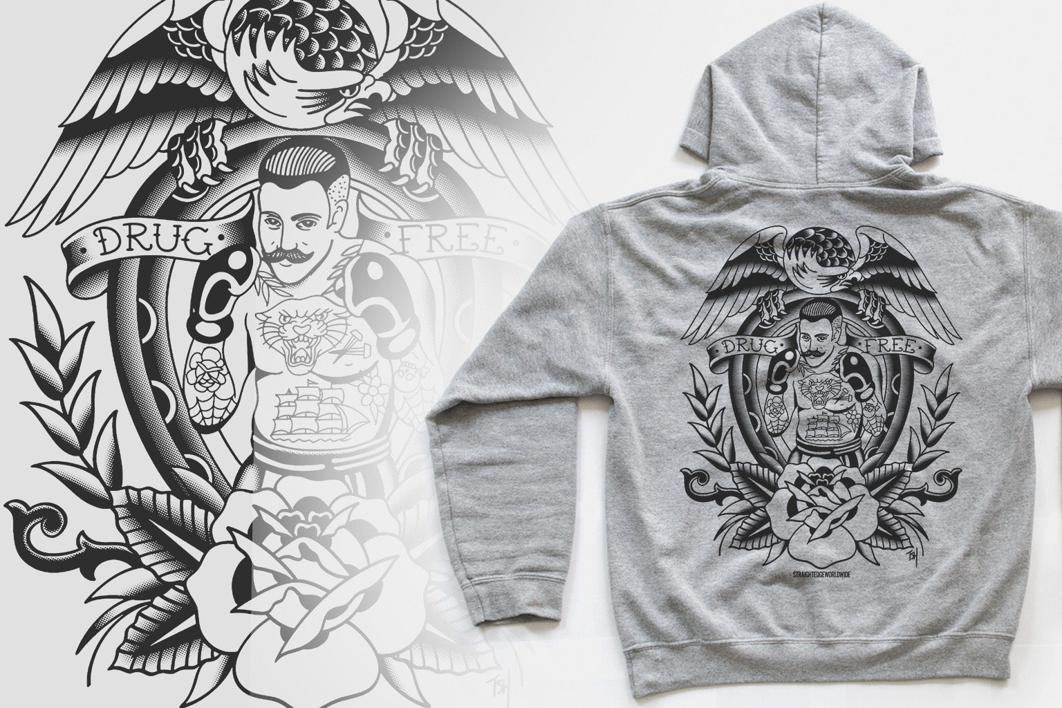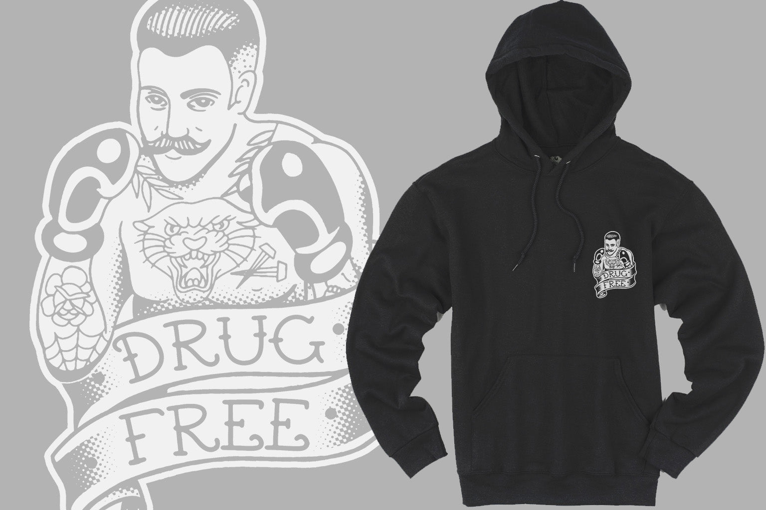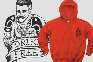 We are very proud to announce our first collaboration with Tyler Hall, a tattoo artist that goes by the name Hard Luck Trad. Tyler really knocked it out of the park with these Drug Free hoodies. Tyler is currently stationed at Requiem Tattoo in Salem, NH.