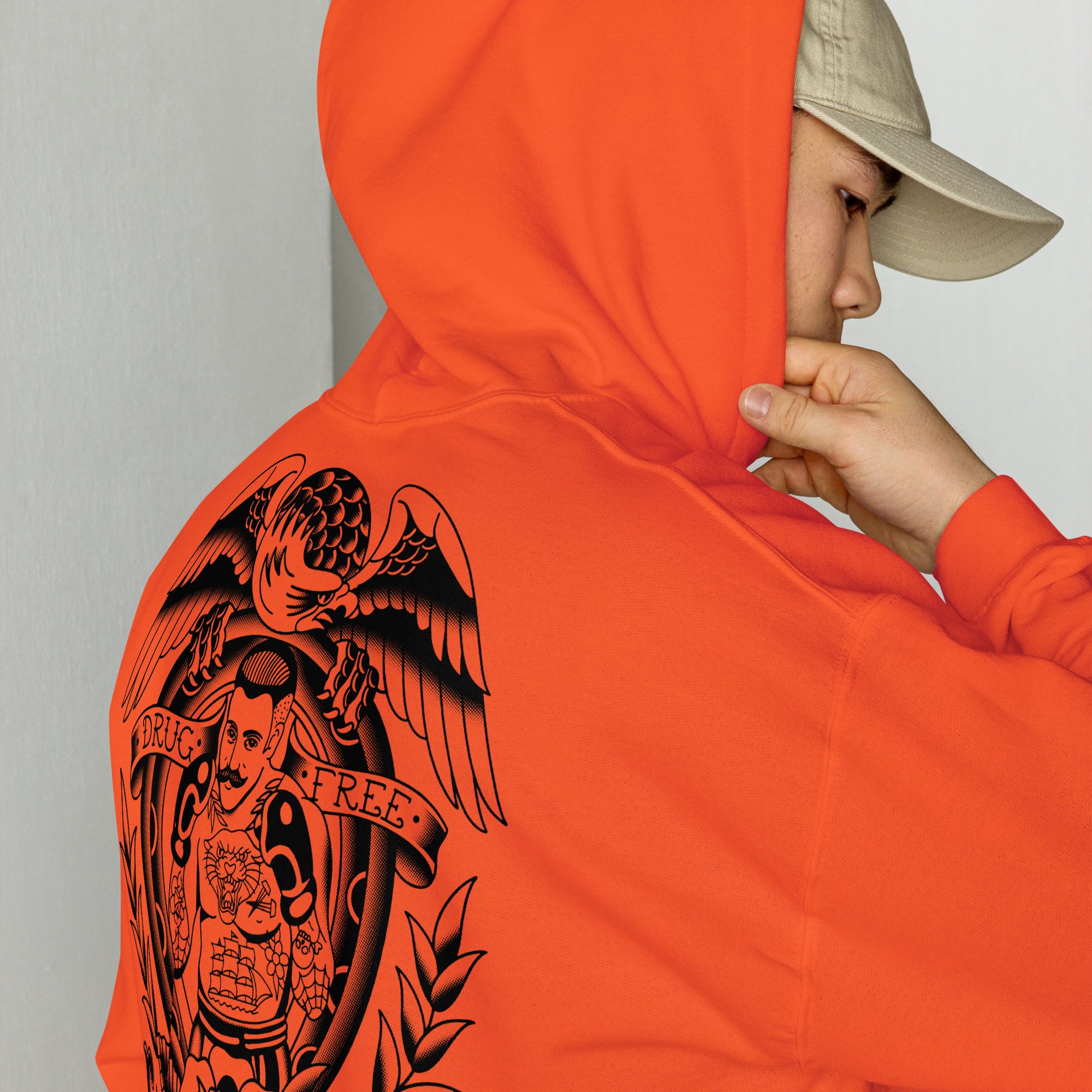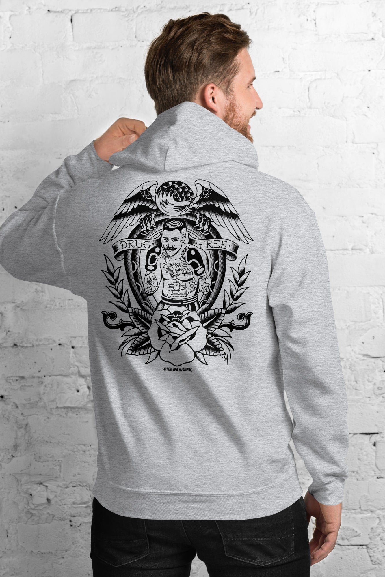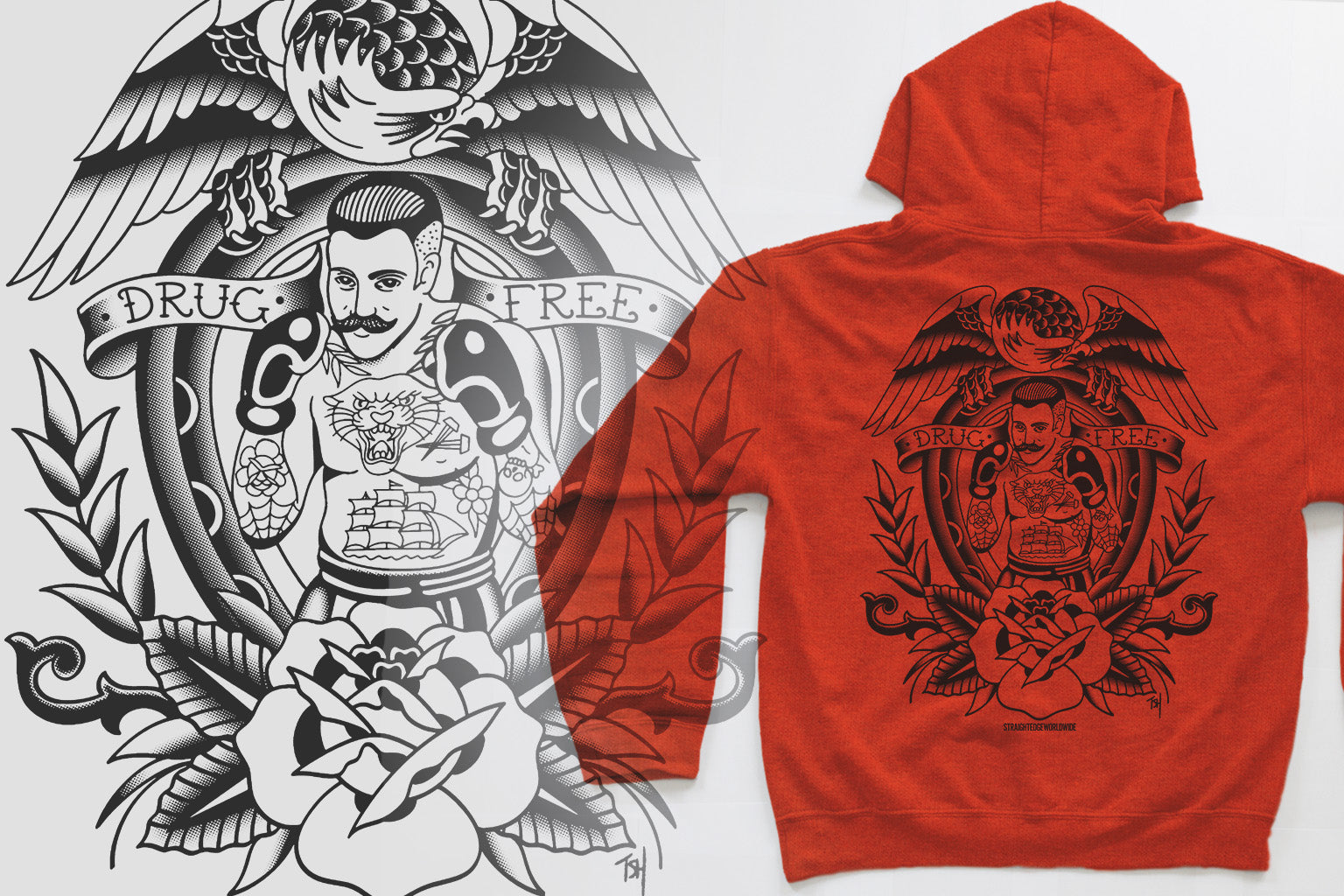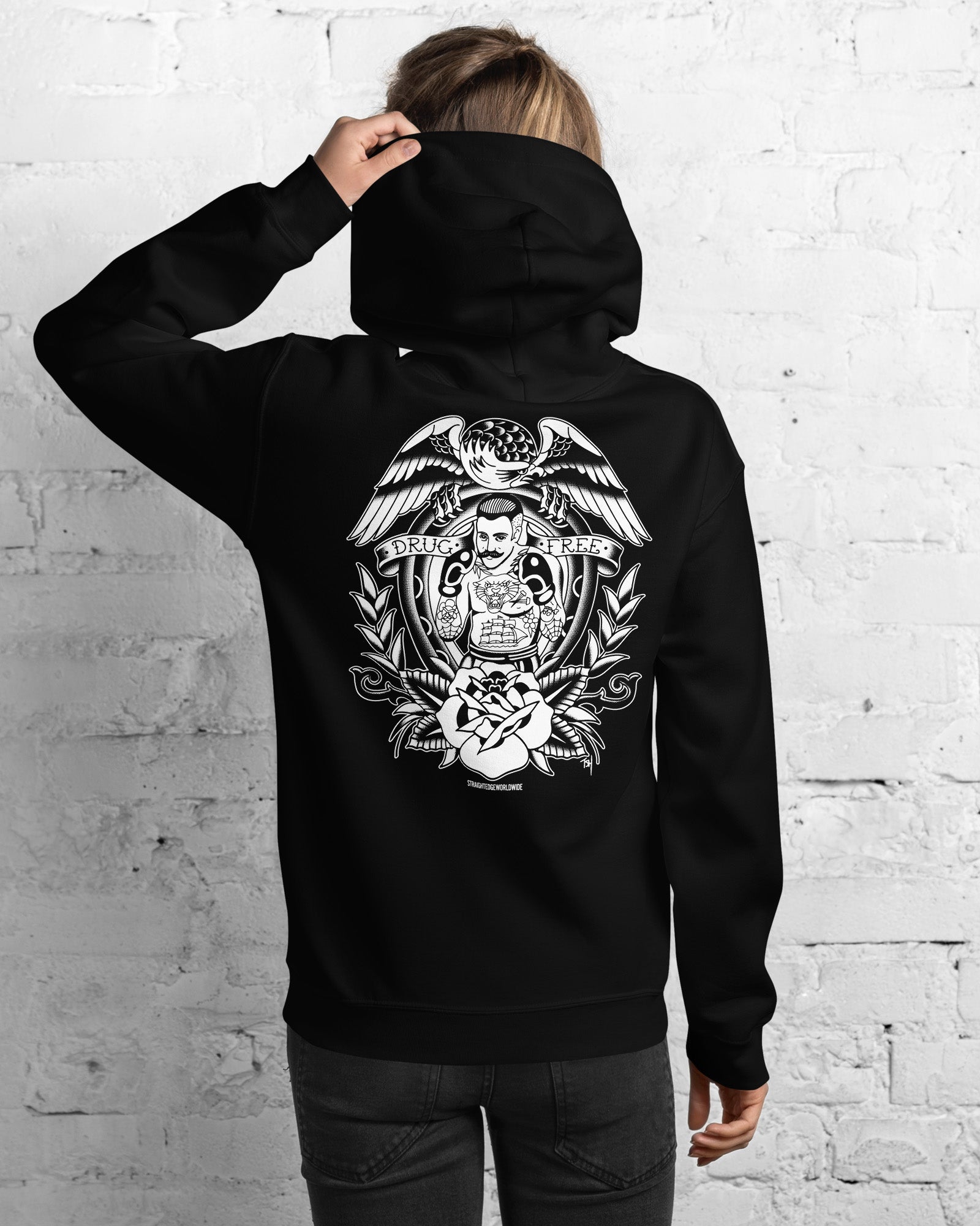 We are very proud to announce our first collaboration with Tyler Hall, a tattoo artist that goes by the name Hard Luck Trad. Tyler really knocked it out of the park with these Drug Free hoodies. Tyler is currently stationed at Requiem Tattoo in Salem, NH.