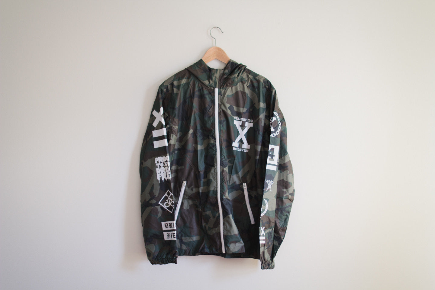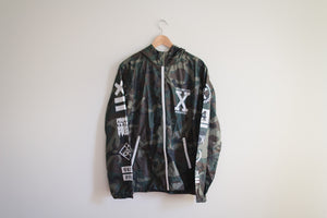 Some people hate windbreakers because when you screen print on them, the ink scratches off. Instead, our logos are exclusion printed - the white areas are actually the raw fabric, how it comes before we add the camo design to it.